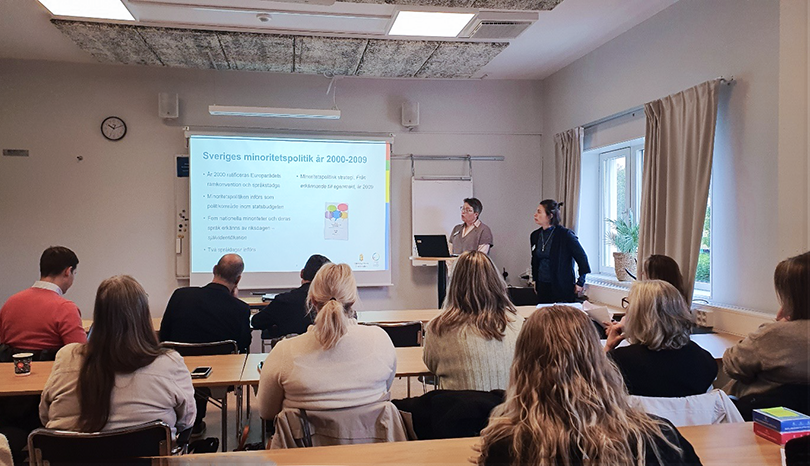 Under förmiddagen presenterade Ellen och Veronica lagen (SFS 2009:724) om nationella minoriteter och minoritetsspråk för rektorer och personal från förskola och skola samt kultur och fritid. Lagen stärker barns rätt att utveckla sitt språk och sin kultur och Strömsund som samisk förvaltningskommun måste erbjuda förskola där väsentlig del av undervisningen bedrivs på samiska om föräldrar/vårdnadshavare önskar det.