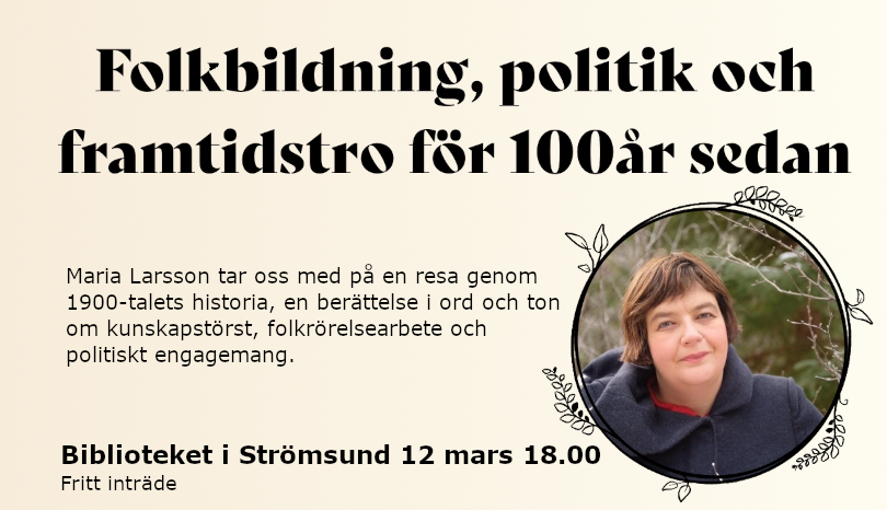 Under temat "Folkbildning, politik och framtidstro för 100 år sedan" bjuder Maria Larsson på en fängslande föreställning i ord och ton.