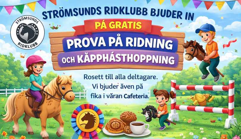 Strömsunds ridklubb bjuder in på gratis prova på ridning och käpphästhoppning, rosett till alla deltagare.